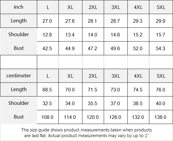 | inch | L | XL | 2XL | 3XL | 4XL | 5XL |